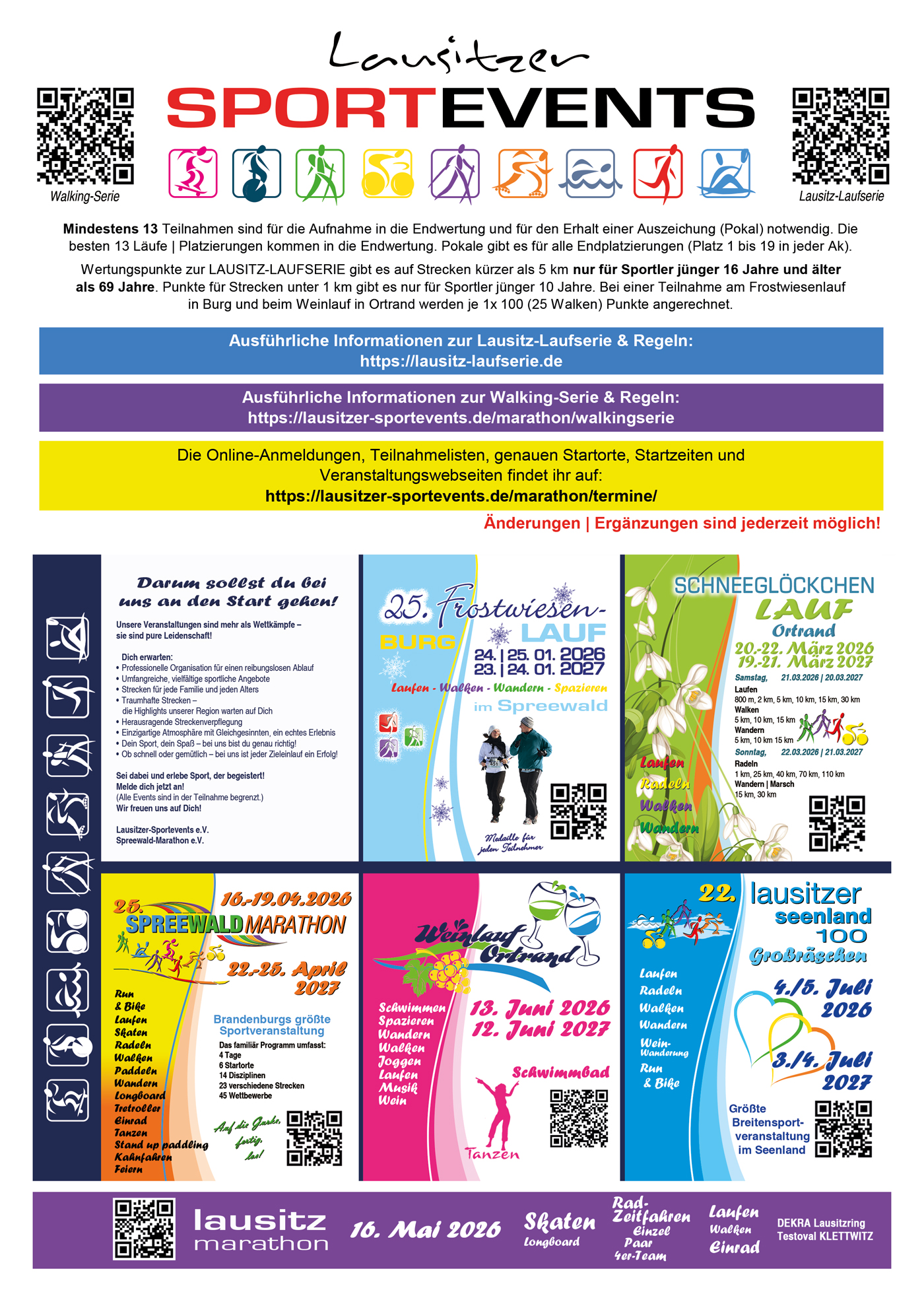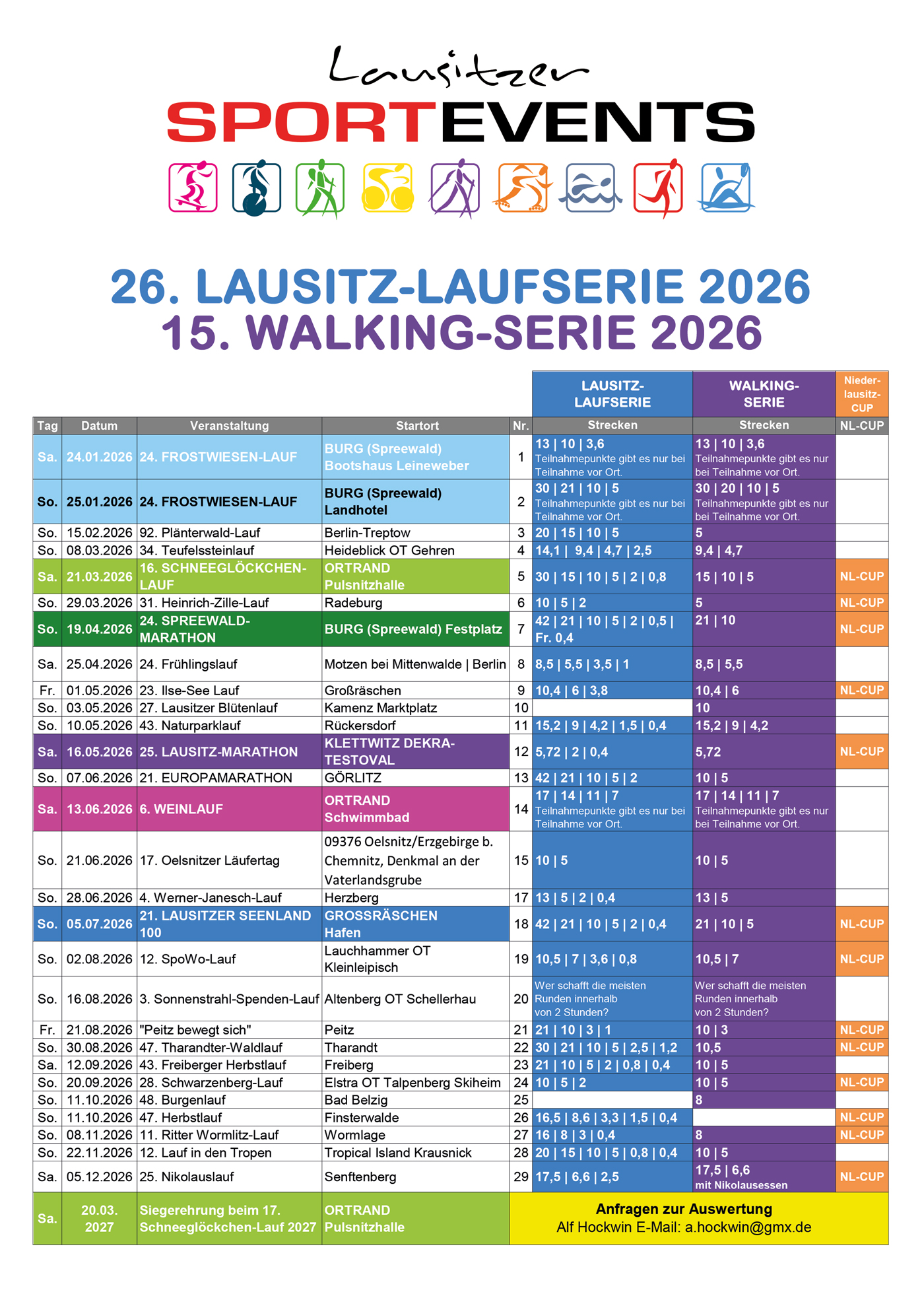 Veranstalter aus der Lausitz und angrenzenden Regionen (Berlin, Brandenburg, Sachsen, Sachsen-Anhalt, Thüringen, Polen), die einen Lauf der Walking-Serie ausrichten wollen, melden sich bitte bis 31.10. über unser Kontaktformular. Die Veranstaltungen eines laufenden Jahres werden nicht automatisch in die Serie des Folgejahres aufgenommen, entscheidend ist die Eventqualität. Jubiläumsveranstaltungen werden bevorzugt!